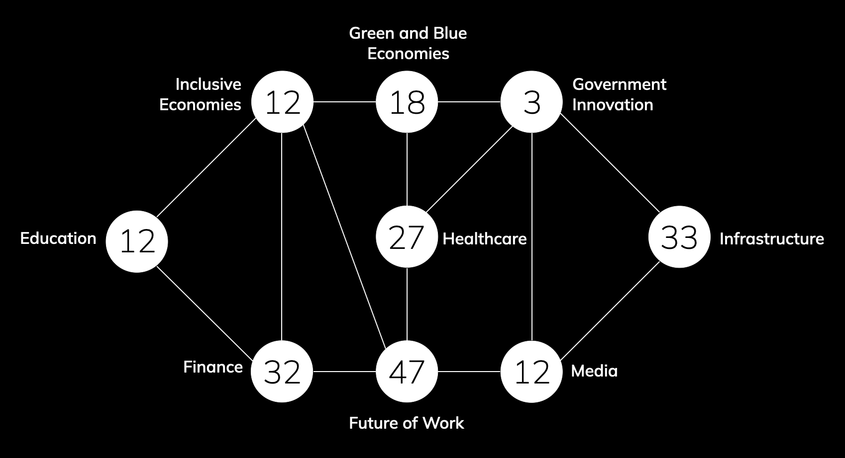 Societal challenges are often deeply intertwined. Accordingly, we create businesses in 9 areas of impact: Education, Finance, Future of Work, Government Innovation, Green and Blue Economy, Healthcare, Inclusive Economies, Infrastructure, and Media.