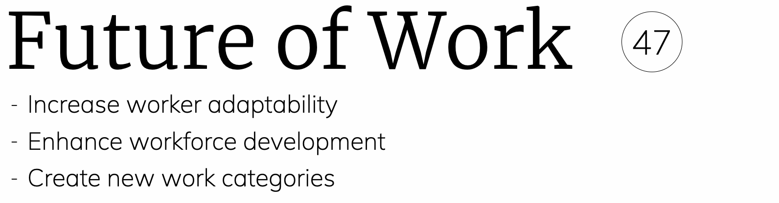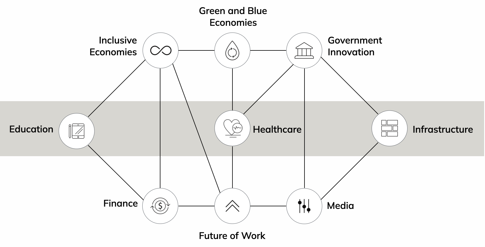 Areas of Impact: Education, Finance, Future of Work, Government Innovation, Green and Blue Economies, Healthcare, Inclusive Economies, Infrastructure, and Media.