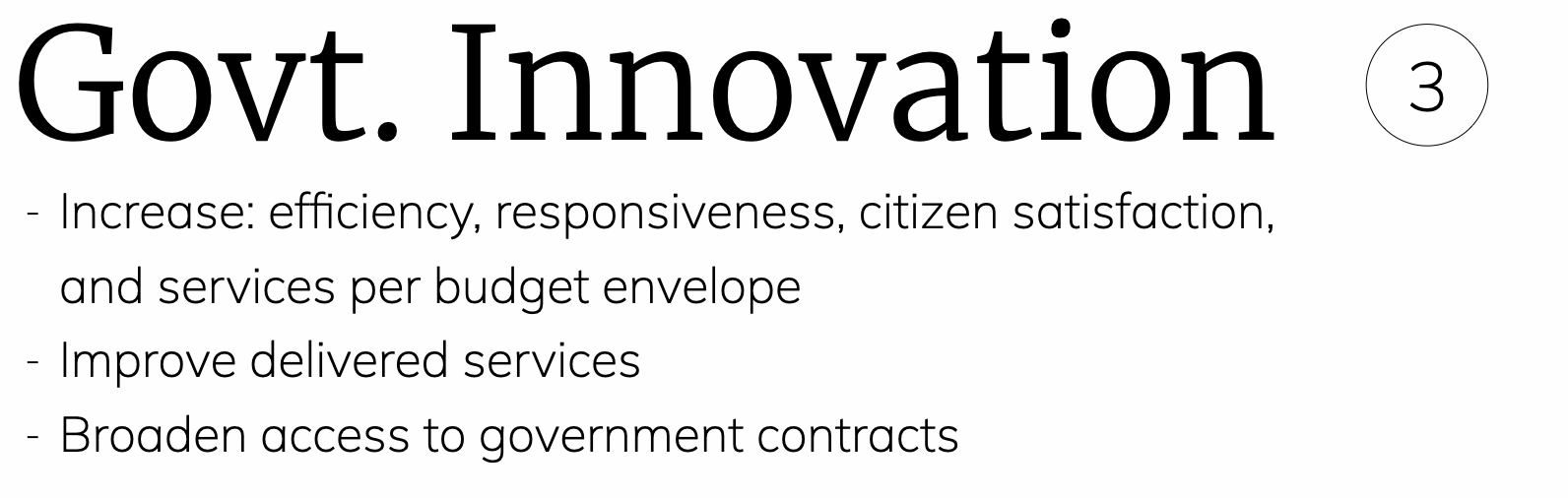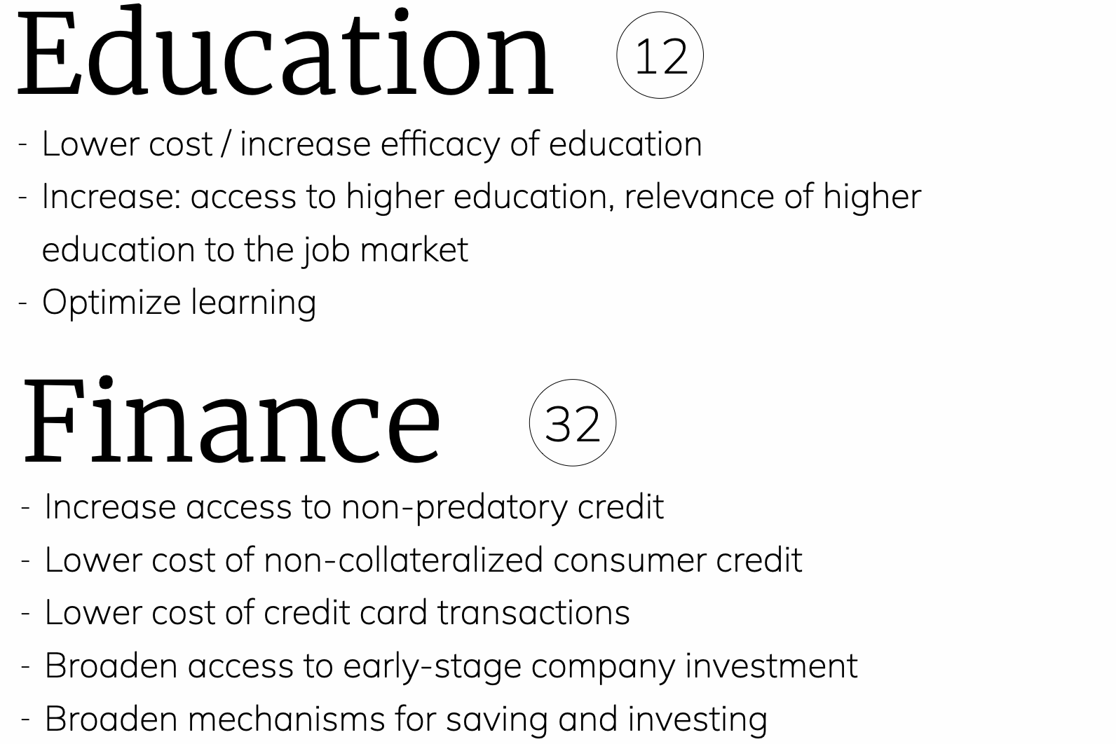 Societal challenges are often deeply intertwined. Accordingly, we create businesses in 9 areas of impact: Education, Finance, Future of Work, Government Innovation, Green and Blue Economy, Healthcare, Inclusive Economies, Infrastructure, and Media.