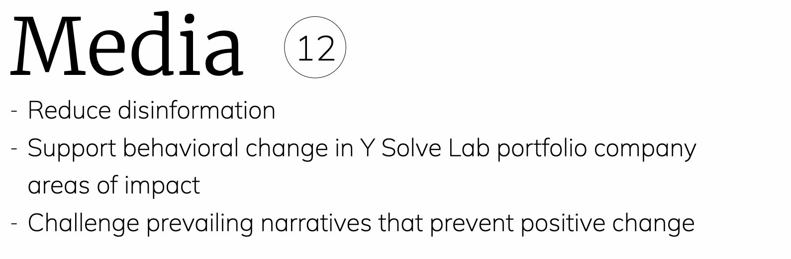 Y Solve Lab. Creates and builds 185 public benefit companies in 9 Areas of Impact.