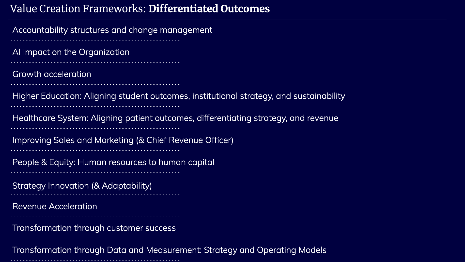 Rather than build idiosyncratic companies, our portfolio companies are built to work together. We combine the expertise of our Year 1 companies to create our Frameworks as Solutions product, which enables organizations to increase the velocity of value creation.